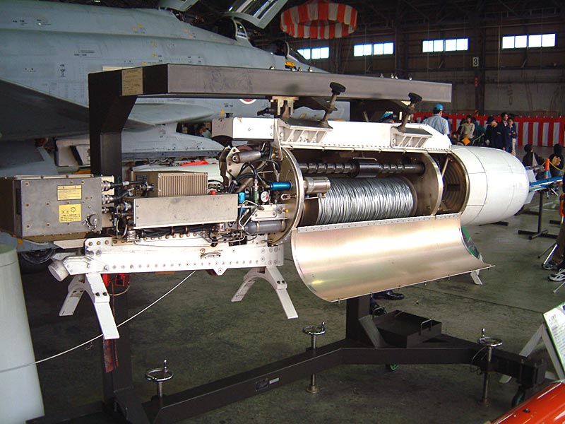 赤外線追尾ミサイルの訓練用弾体で、先端についているシーカー部は実弾と同じ。赤外線ミサイルの場合はミサイル自体のシーカーで目標を捕らえなければロック・オンすることが出来ないので、このような訓練弾が必要になる。ただし、推進剤は積んでいないので発射することは出来ないし、もちろん弾頭も付いていない。外観からも実弾と識別できるように弾体が青く塗られている。 |